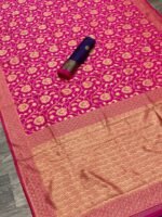 Rashmika Beautiful Art Silk Jacquard Border Saree With Unstitched Blouse For Women Wedding Wear Party and running use also( Include 5.5m Saree and 0.80m Blouse ) Baric jacquard patta. Paired with a matching unstitched blouse piece with similar weaved floral Silk. The length of the blouse is 0.80 meters. Beautiful rich pallu and jacquard work on all over the saree.